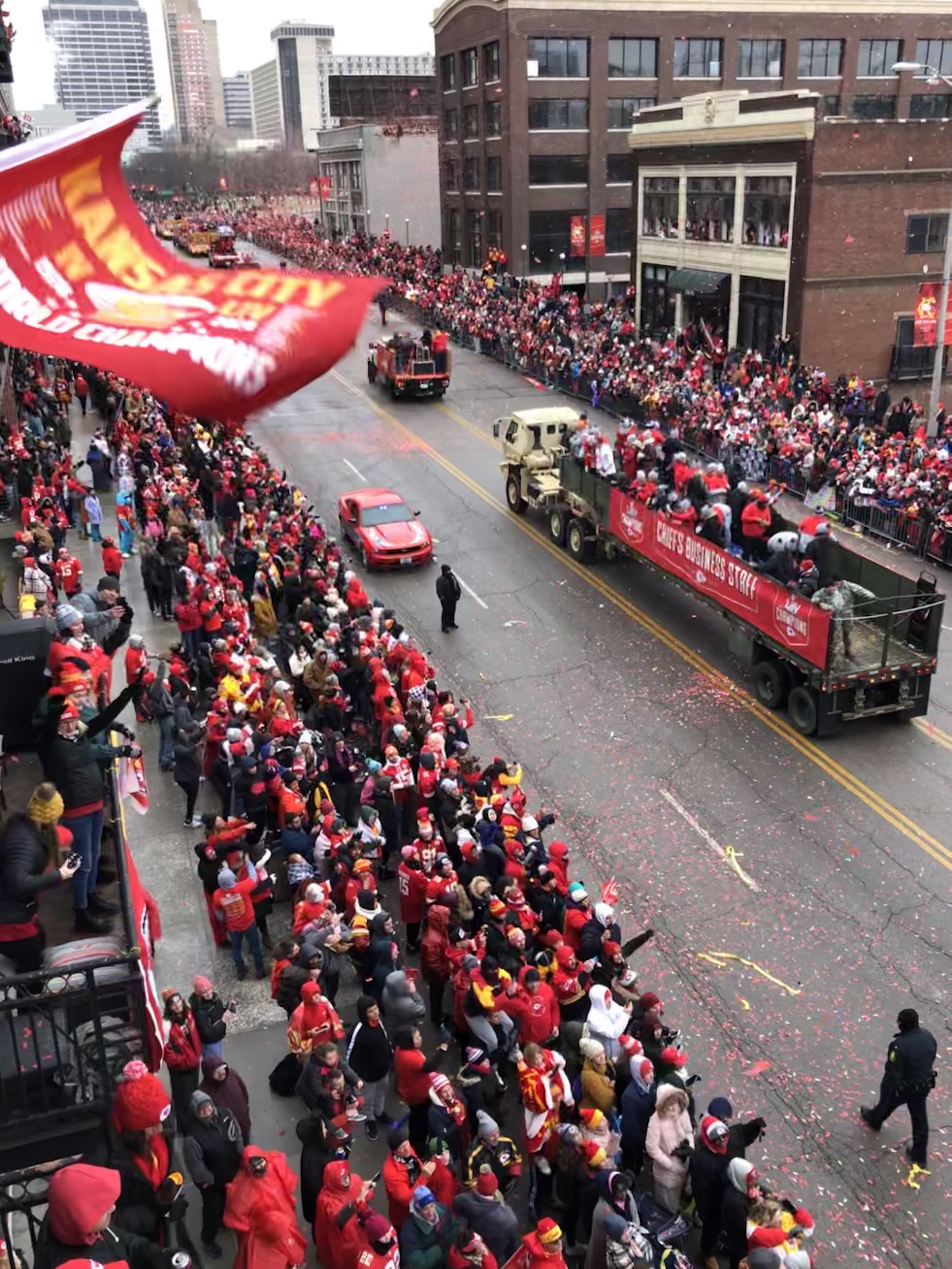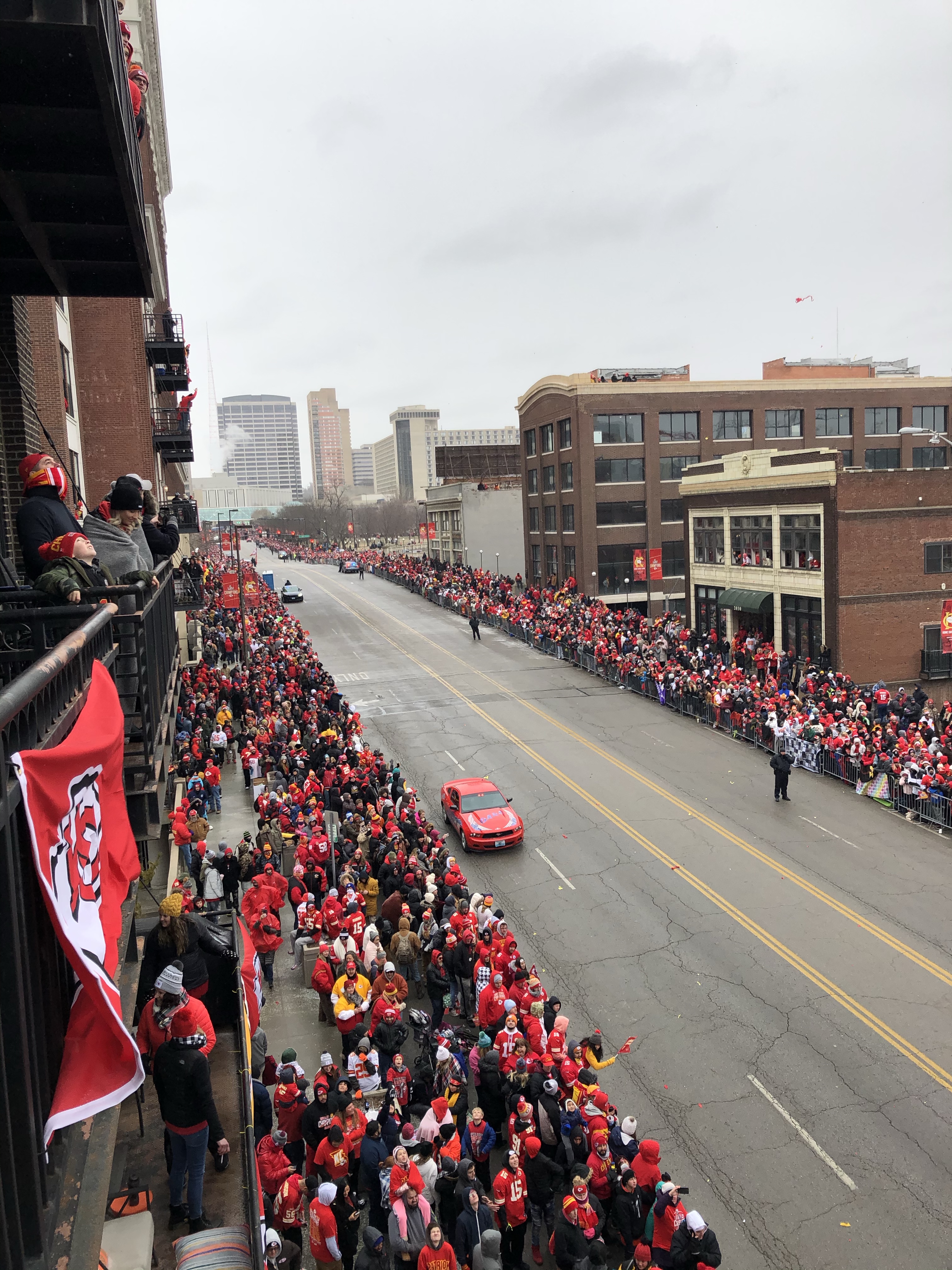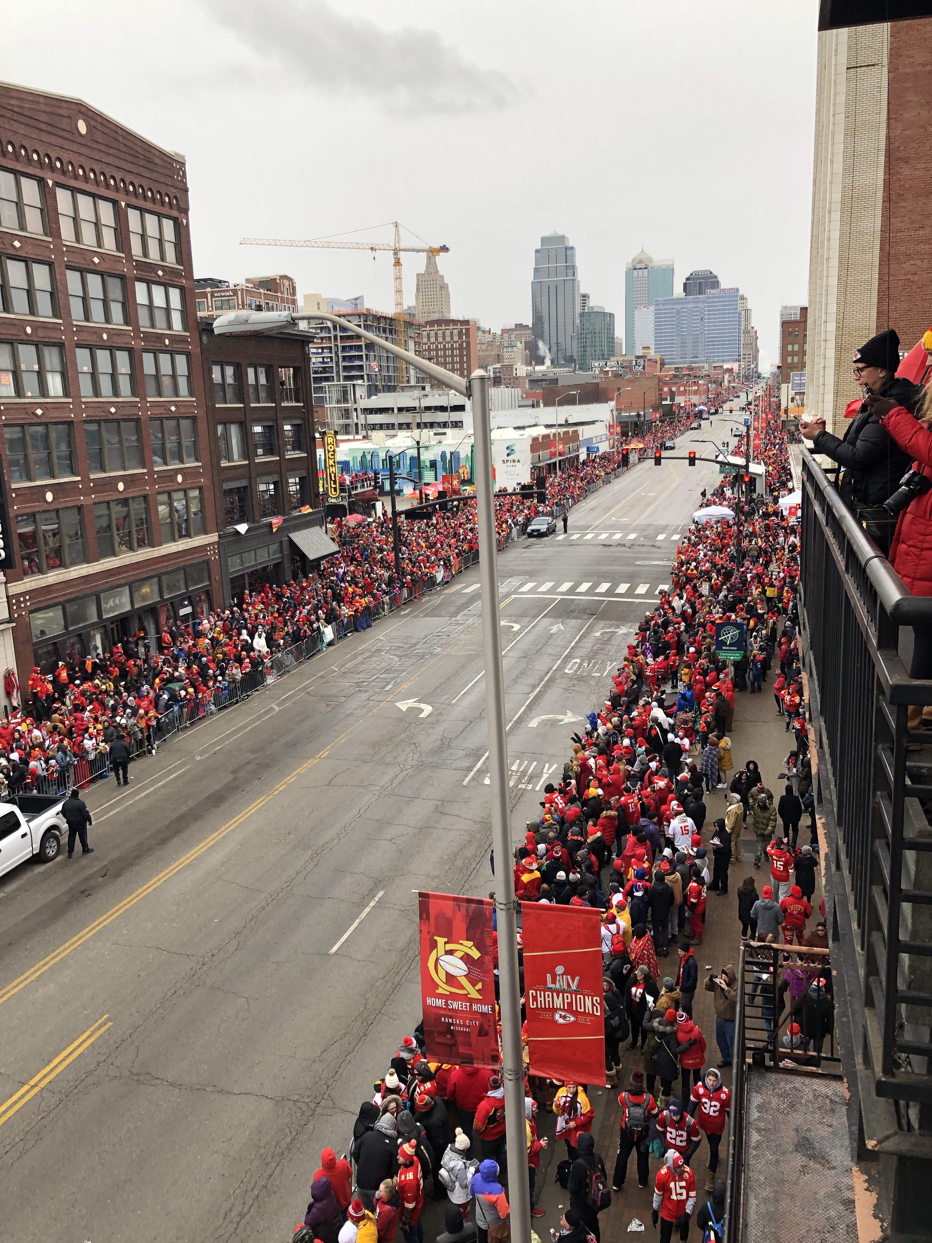 My friend Brian, pictured in the first photo with the trophy, lives in the Western Auto lofts on Grand with a balcony over the parade route. He was kind to let my brother David and I and some other friends come watch. Same spot we watched the Royals parade drive by a few years ago.